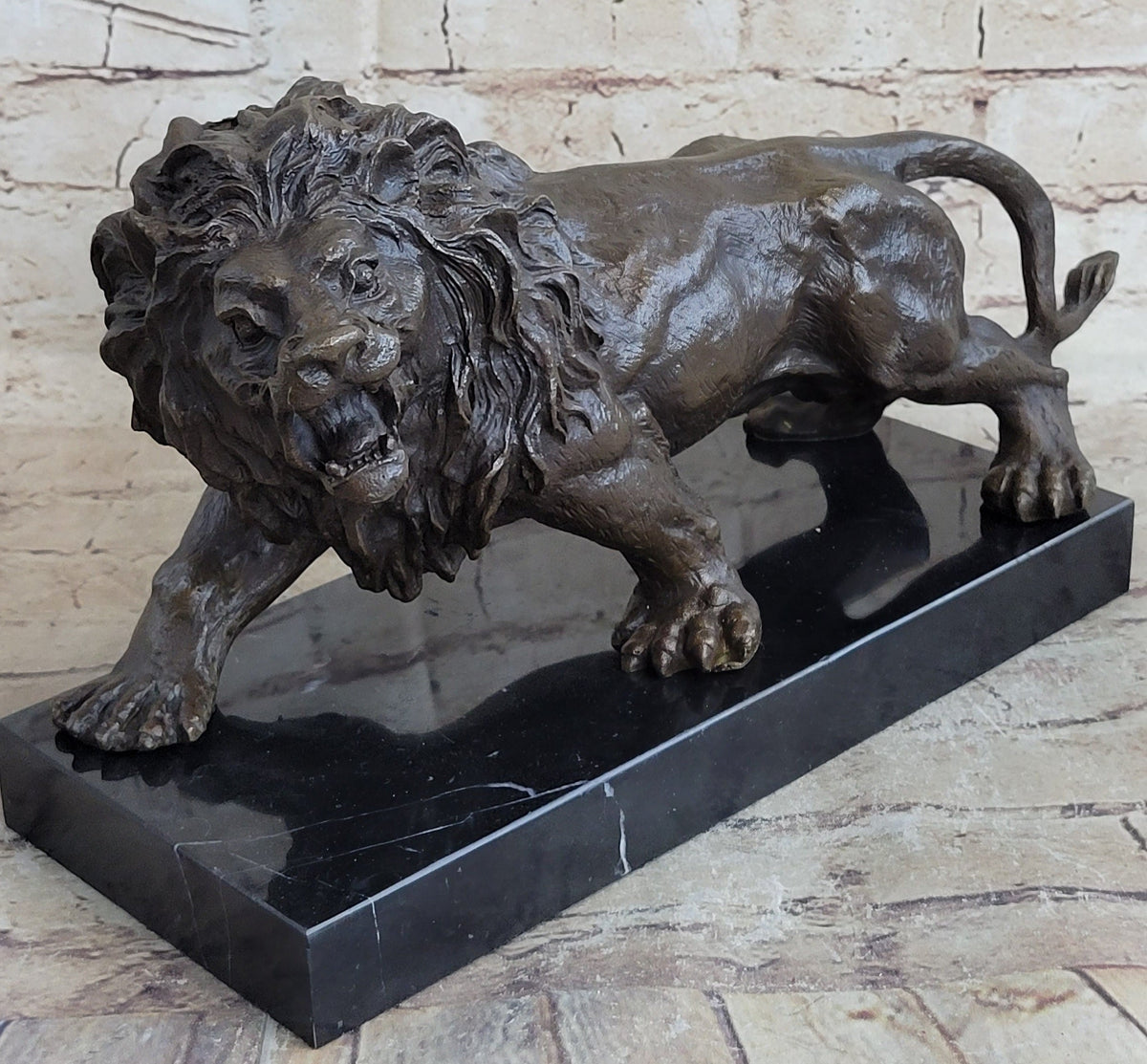 Bronze Sculpture Angry Hungry Male Lion Marble Base Figurine Art Deco Figure