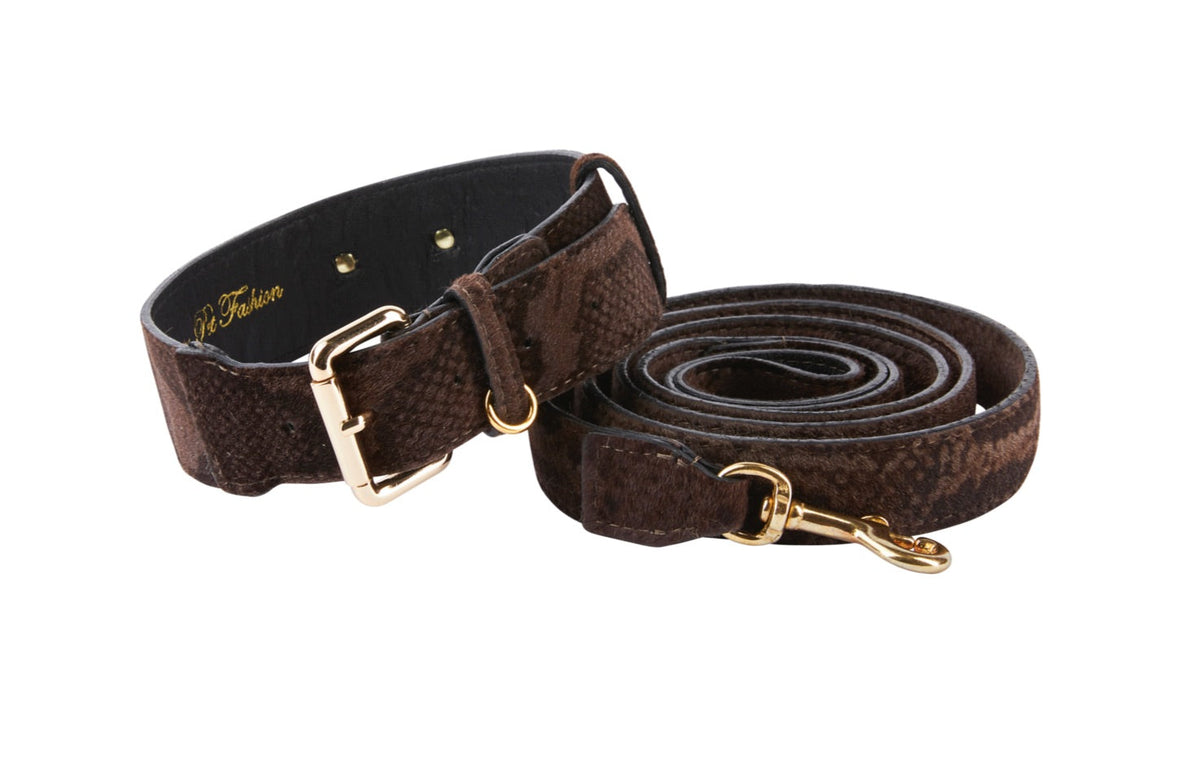 Brown Snake Print Hair On Hide Italian Leather With Classic Hardware Collar & Leash Set