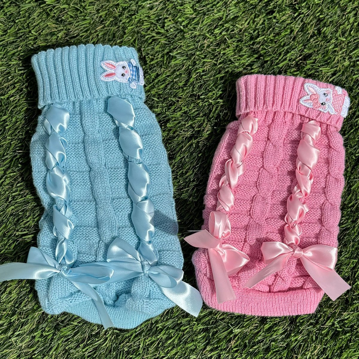 Celebrate this Easter fashionably with our super sweet blue and pink sweaters! Embellished with beautiful satin ribbon and an adorable bunny on the neckline. Complimented with a matching bunny hair clip! These sweaters stretch up to 2 inches from the size chart measurements, providing ultimate comfort. Please see the size chart on the last photo!