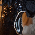Bring out your inner biker with this seductive dog party dress! Designed exclusively for Posh Dog Life, this one-of-a-kind handmade “Elektra” dress is exquisitely crafted by C’Mimi’s world-renowned pet fashion Designer Jan Ben with the finest details. This luxurious dog dress features glittering black sequins, silver beaded leather trim down the midline and cascading black lace at the neck. Truly a “Wow!”, this luxurious sparkling dog dress fits all sizes and is a wonderful addition to your dog’s wardrobe for special occasions including holiday parties, weddings, anniversaries and photoshoots.