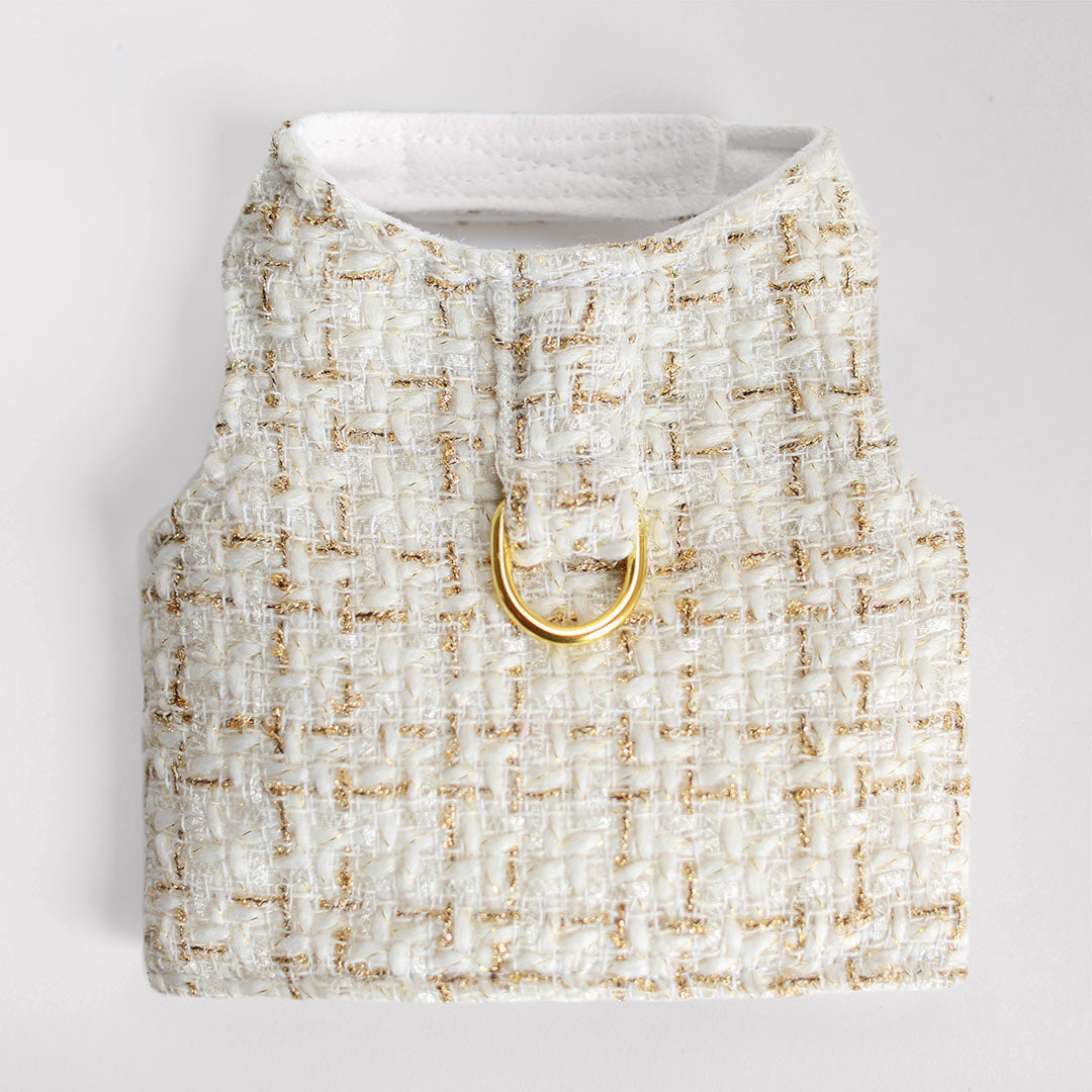 Chantel Tweed Dog Harness Cream offers irresistibly cozy. Your precious pooch will look regal in this Chantel Tweed Dog Harness By Hello Doggie. The beautiful soft tweed fabric has a timeless design that is sure to please the eye of any fur baby mom or dad This harness features adjustable velcro straps for easy and a gold d ring that ensures your pup stays safe at all times. Limited Edition Wholesale | * Harnesses are handmade sizes may vary slightly Designed to elevate your pet’s lifestyle with quality and comfort. Perfect for stylish homes and pampered pets. This is more than a product—it's a pet essential.