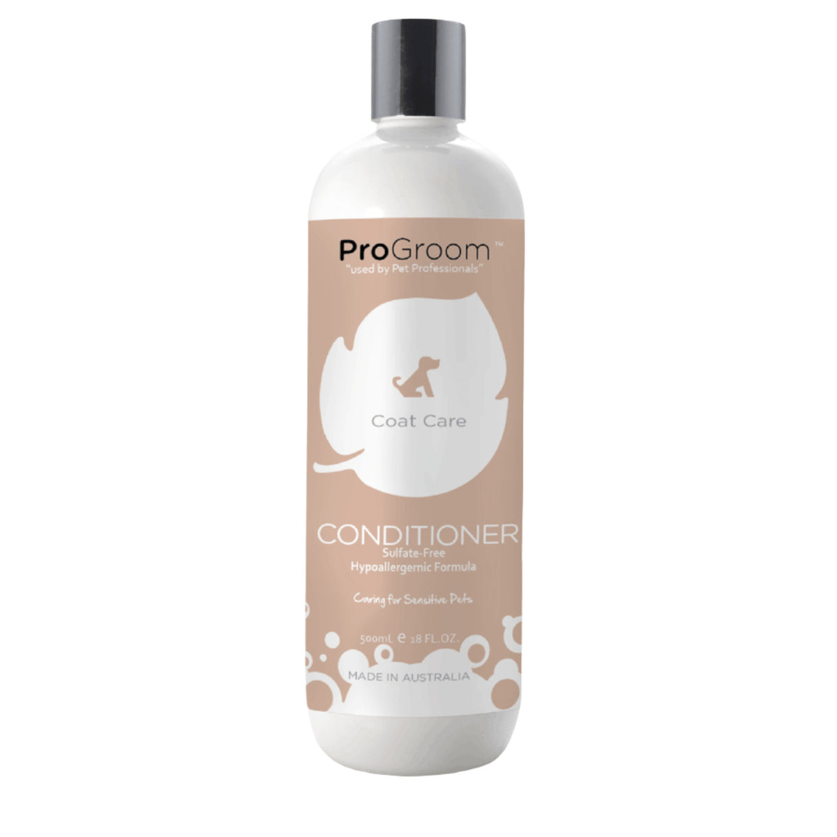ProGroom Coat Care Conditioner 500ml Natural plant extracts and wheat proteins moisturize, build volume, protect, and restore troublesome coats. Moisturises and rehydrates without weighing down coats Restores and Maintains Coats Rich emollient formula Restores vitality...