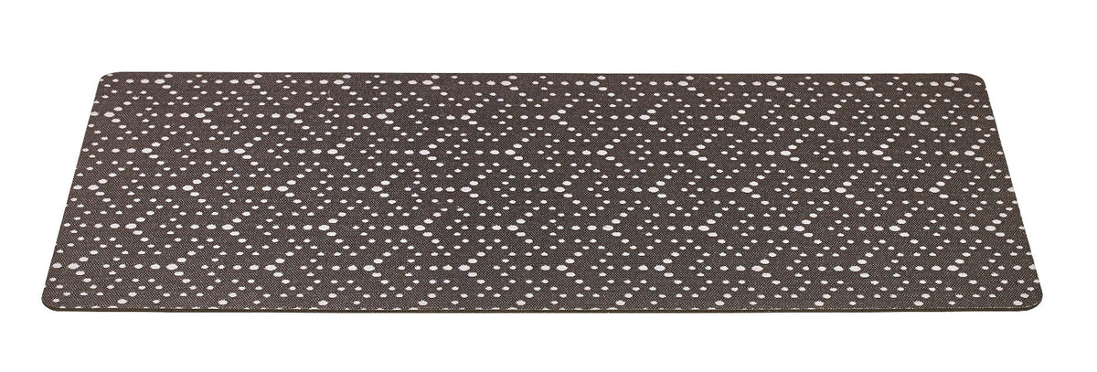 Protect from Spills with Panache! Easy clean, color safe polyester graphic prints. Gourmet placemats repel dirt, spills and mess ! Durable, non skid rubber backing is made from recycled rubber tires. Use as a dog feeder placemat or use as a comfort mat to ease stress on feet, back and joints when standing in high traffic areas, and on hard surfaces. Machine washable.