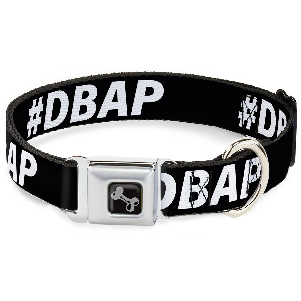 Dog Bone Black/Silver Seatbelt Buckle Collar - #DBAP Hash Tag Text Black/White