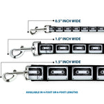 This fashion-forward dog leash is a great way to show off your favorite characters or brands. The durable components and beautiful printing ensure that the colors will continue to pop for years to come! It is made of high-density polyester and steel hardware. The leash is available in 0.5, 1.0 and 1.5 inches wide, and 4 and 6 feet in length. This product is Made in the USA by Buckle-Down Inc. and officially licensed by Buckle-Down.