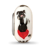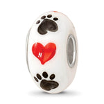 Each meticulously hand-blown hand-painted Fenton glass charm is initialed by the artist and finished with a ceramic glaze and a sterling silver core embossed with Fenton USA! This white charm features a dog, paw print and heart design that is approximately 8mm in width by 15mm in length. Fenton Made in America handcrafted glass beads are interchangeable as well as compatible with other popular 3mm width bead style bracelets and necklaces. Colors and size may vary slightly.