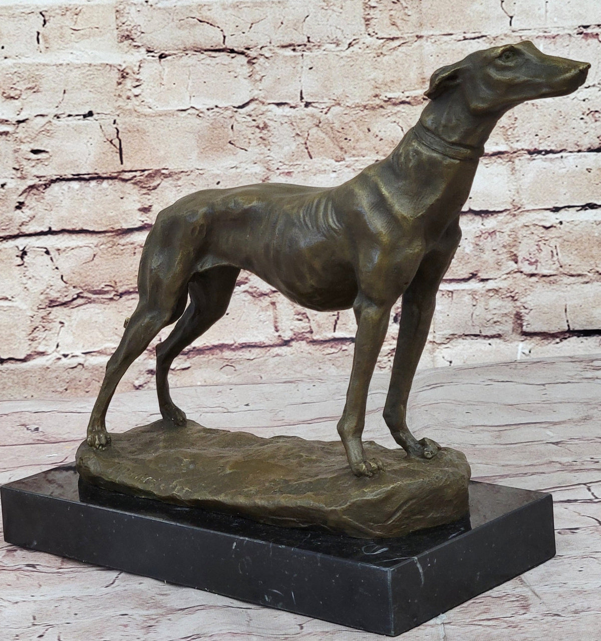 Embrace the exquisite craftsmanship and artistic finesse of the magnificent bronze statue inspired by Emmanuel Fremiet, a revered sculptor renowned for his exceptional animal works. Exuding the timeless charm and allure of antique bronzes, this finely sculpted greyhound captures the essence of Fremiet's profound influence on animal sculpture. With meticulous attention to detail, every aspect of the sculpture, from the powerful pose to the intricate facial features, embodies a sense of grace and vitality. Resting on a solid marble base, this elegant piece serves as a striking centerpiece, radiating a sense of sophistication and artistry that is sure to captivate any admirer of fine sculptures.Bronze Dimensions with Marble Base: Height 10" X Length 10"