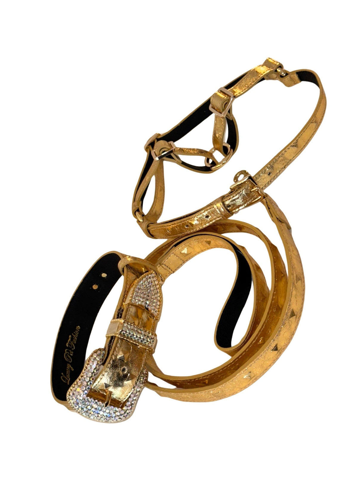 Glam Gold Embossed Studded Italian Leather Collar, Leash & Harness Set With Our Custom Swarovski Crystal Buckle