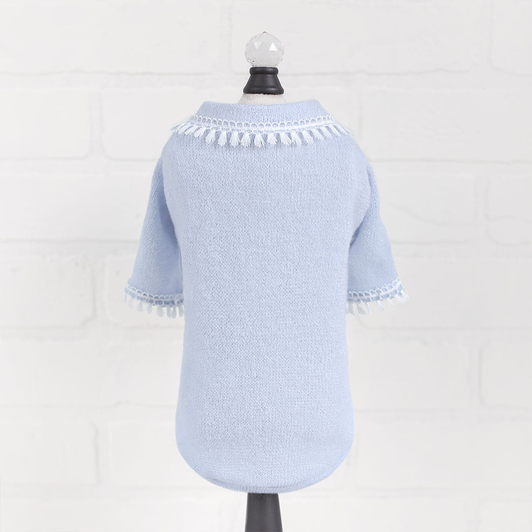 Heavenly Kiss Dog Sweater Blue offers exclusive quality. Just in time for the change of season, keep your baby stylish and warm in our new sweater collection. The Heavenly Kiss dog sweater is made from light soft cotton knit fabric to keep out That extra chill. This sweater features a dainty handmade crochet cotton lace to complete the look. Perfect for a day out on the town when paired with one of our coats or harnesses. Hand wash, Air dry or tumble on low.