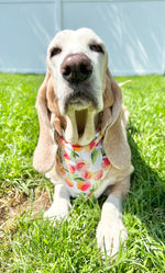 ALL FLORAL BANDANAS & BOW TIES Paisley Paw Designs Dog Bandanas are handmade in the USA with attention to every detail. Lightweight - just tie around your dogs neck, dogs don't even notice they're wearing it. This bandana is already cut into triangle a shape. Our Bandanas are made with quality fabrics using designer prints and sewn for durability. Each Bandana has a rolled hem (edge) on all 3 sides for a finished look! Our Bandanas are “one of a kind” as pattern placement varies. How to Use: For large dogs just tie around neck, smaller dogs roll down the top edge to make smaller and tie around neck, leaving a few inches for comfort. Wear bandana in front of chest or to the side or laying on dogs back – you choose the look! Care: Machine wash cool water, lay flat to air dry Fabric: 100% Cotton Sizes: are approximate and may vary slightly X-Small - 13" x 13" with 18" diagonal Small - 15" x 15" with 21" diagonal Medium - 18" x 18" with 25" diagonal Large - 21" x 21" with 29" diagonal X-Large - 24" x 24" with 33" diagonal NOTE: Always give yourself a little wiggle room in your measurements + a few inches on each end for the knot!
