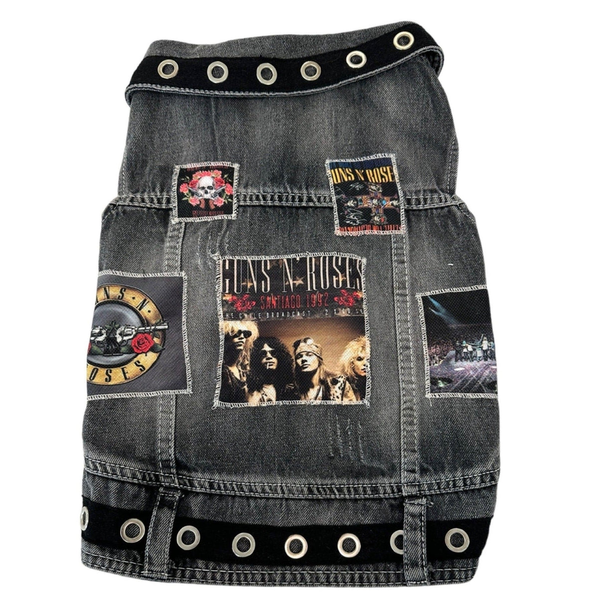 Get your hands on a one-of-a-kind vintage masterpiece with the Deluxe Artwork Vest. Each piece features an inspired assortment of Iconic Band Album and CD artwork. Patches are laid out by hand and vary from vest to vest. With this, you'll have a truly unique piece that sets you apart from the crowd. Our deluxe version features a fierce silver grommet trim. You can also add a D-ring for stylish leash walking! Don't forget to check out our size chart to make sure you get the perfect fit.