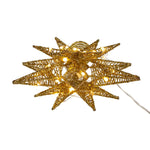 Add a beautiful touch to the lighting and décor of your Christmas tree with Kurt Adler's 11-Inch Pre-Lit Twinkling LED 60-Light Gold Starburst Tree Topper. This gold starburst tree topper is pre-lit with 60 superbright warm white LED twinkling lights and has clear wire so that the wire blends into your tree. The tree topper features 2 inch bulb spacing, a 9 foot clear lead wire and a UL adapter. This item is for indoor use only.