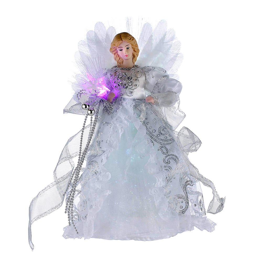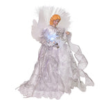 This Kurt Adler 12-inch CUL White and Silver Fiberoptic LED Angel Treetop is a fun and festive addition to your Christmas tree décor. This blonde angel wears a white and silver accented gown. Her fiber optic wings sets her apart from all other Angels. Includes DC 4.5V 200MA indoor use adaptor.