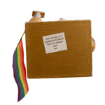 This 12-Inch Wooden Gay Pride Nutcracker is a fun and unique addition to any holiday décor or nutcracker collection. The nutcracker is adorned in a beautiful sequin jacket with blue with glittery stripes. He holds a rainbow flag and wears a red and gold crown with jewels. He stands on a gold base.