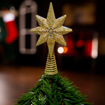 Kurt Adler's dazzling Gold Glitter Polaris Projector Treetop, the crowning jewel of your holiday decorations that will transform your Christmas tree into a shimmering masterpiece. This unique and enchanting treetop ornament combines the elegance of a traditional tree topper with the magic of a celestial light projector, casting a celestial display of stars and the Polaris star directly onto your tree and the surrounding room. Crafted with meticulous attention to detail, it boasts a classic star design with a modern twist. Its surface is adorned with a luxurious gold glitter finish that radiates warmth and sophistication, adding a touch of opulence to your holiday decor. What sets this treetop apart is its innovative projector feature. At the core of the star, a high-quality light projector is discreetly placed, ready to cast a mesmerizing display of twinkling stars onto your tree's branches and your ceiling. The centerpiece of the projection is the Polaris star, also known as the North Star, a symbol of guidance and light in the night sky. It is designed for easy installation and comes with a secure clip attachment that effortlessly affixes to the top branch of your Christmas tree. Once in place, the projector can be adjusted to create the perfect lighting ambiance, whether you desire a subtle starry glow or a more pronounced celestial spectacle. Whether you're looking to add a touch of magic to your Christmas tree or create a captivating centerpiece that captures the wonder of the night sky, our Gold Glitter Polaris Projector Treetop is the perfect choice.