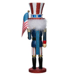 This 15-Inch Hollywood Wooden Uncle Sam Nutcracker is a fun, festive way to add to your holiday décor or nutcracker collection! Designed by renowned artist Holly Adler, Hollywood Nutcrackers is a whimsical collection of nutcrackers created exclusively for Kurt S. Adler, Inc. and features an assortment of designs including Christmas, fantasy and everyday nutcrackers. Their designs put a unique, vibrant, memorable twist on traditional nutcrackers. This Wooden Uncle Sam Nutcracker by Hollywood Nutcrackers is wearing a patriotic red, white and blue Uncle Sam-inspired outfit, complete with a large American flag-style top hat, and a large American flag in his hand.
