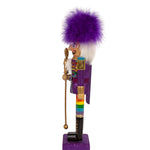 This 15-inch Wooden Gay Price Nutcracker is a fun and unique addition to any holiday décor or nutcracker collection. The nutcracker is adorned in a beautiful purple jacket with rainbow pants. He holds a staff that says "Love is Love." He stands on a glittery purple base which matches his jacket. This nutcracker is for decorative use only.