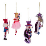 Bring the beauty of the Nutcracker Ballet to any holiday décor or Christmas tree with these 5.25-Inch Nutcracker Suite Ornament Set, 4 Piece Set from Kurt S. Adler featuring the main characters from The nutcracker ballet. Each ornament set includes Clara in a pink and white dress, Drosselmeyer in a purple cape, the Nutcracker Prince in a red, white and blue suit with a sword, and the Mouse King in a purple cape with a sword and staff.