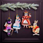 This 5-5.5-Inch Noble Gems Alice in Wonderland 4-Piece Ornament set from Kurt Adler is a unique addition to any holiday décor or Christmas tree. This 4 piece box set features the characters from Lewis Caroll's book Alice's Adventures in Wonderland. Alice, the Queen, the White Rabbit and the Mad Hatter are included in this set. The perfect addition to any book lover's holiday décor!