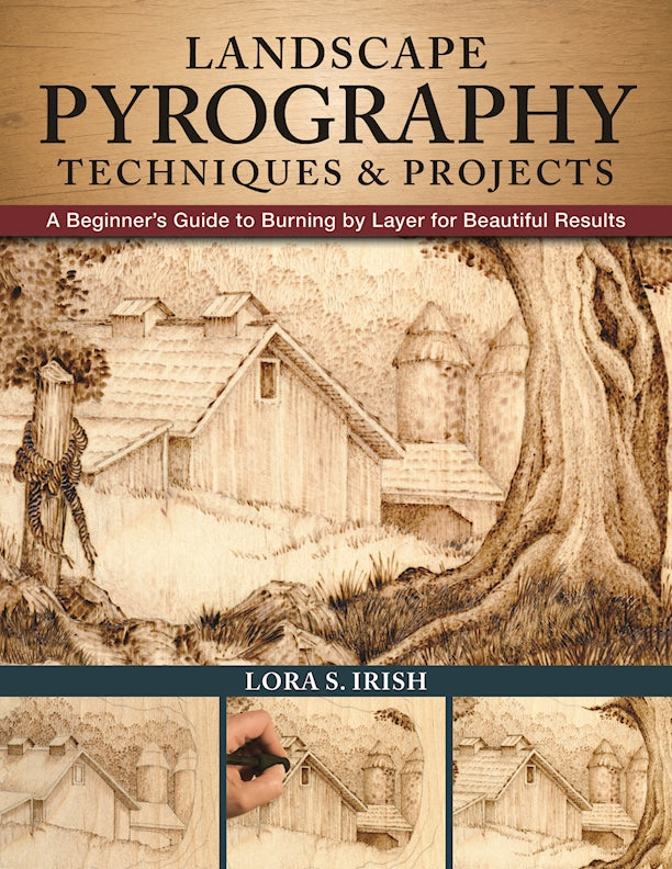 Learning pyrography has never been easier with this comprehensive guide. Nationally recognized artist and pyrographer Lora S. Irish reveals her easy-to-learn methods for working in layers to obtain stunning results. Lora introduces you to many different aspects of burning, and guides you through small practice patterns so you can discover and apply all the techniques. Learn about pen tips, temperature settings, fill patterns, and everything else you need to burn interesting, textured, lifelike landscapes.Inside Landscape Pyrography Techniques & Projects you’ll find:• Complete guide to supplies, burning units, pen tips, pyrography media, safety, and more.• How to create practice boards for pen tip strokes, texture fills, landscape features, and architectural elements.• Four complete practice projects for a wide range of pyro techniques and effects.• Step-by-step project for a rustic Mail Pouch Tobacco-style barn.• Dozens of ready-to-use patterns for landscape scenes, with finished examples.