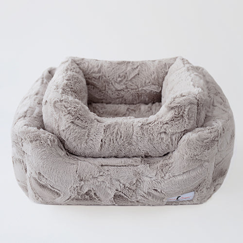 Luxe Dog Bed Taupe offers tailored for pets. Allow your pup to experience the comfort and softness of this elegant Luxe Bed by Hello Doggie. Low rise front for easy access. Made from the highest quality of fabric and stuffed to perfection with 100 poly-fiber fill for longer-lasting fullness and durability. Reversible, machine washable and tumble dry for easy care.