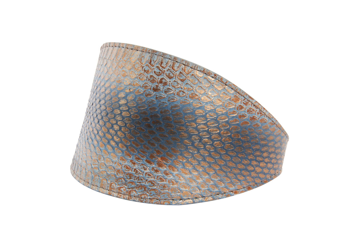 This stunning Luxury Pet Fashion Baby Blue/Blue/Bronze 3 Wide Snake Collar, is the perfect statement piece. Lined in super soft black Italian leather. Neck Size- 14-19. Custom sizing available.