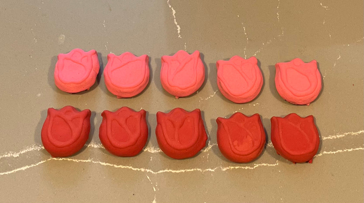 Show your pup the love with these mini rose treats! Ingredients: rice flour, oat flour, whey, ground flaxseed, egg whites, baking soda, honey, and yogurt icing. Guaranteed Analysis: Crude protein (min) 11%, crude fat (min)...