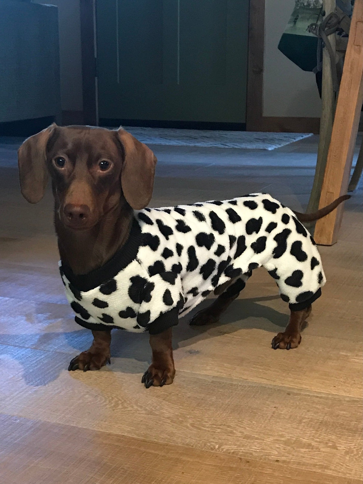 Moo Jams are made of soft and cozy fleece. Sure to keep your pup warm all winter long!