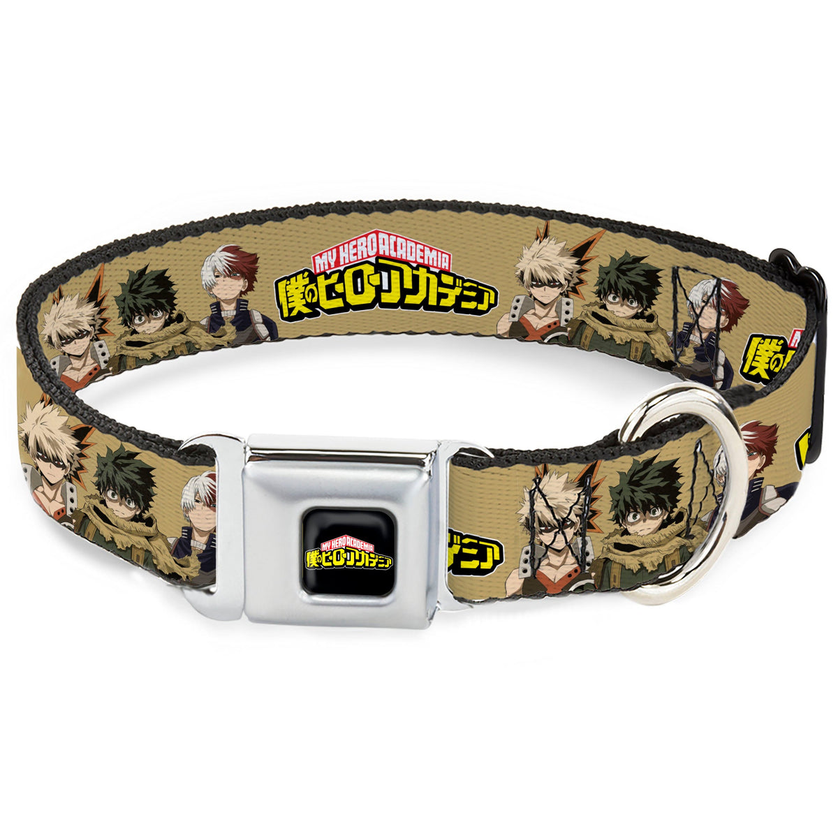 MY HERO ACADEMIA Title Logo Full Color Black Seatbelt Buckle Collar - MY HERO ACADEMIA Character Trio Pose and Title Logo Tan