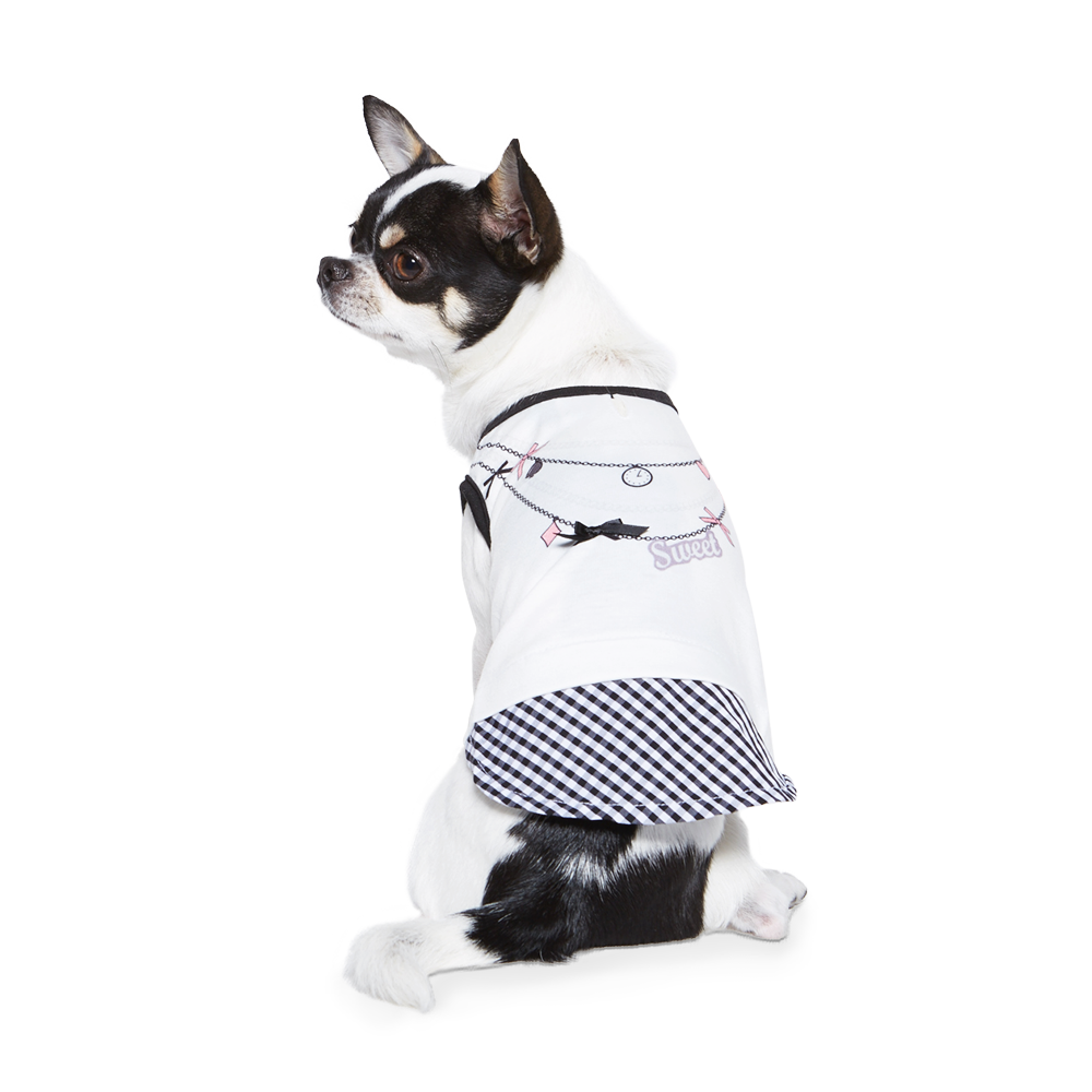 This tank features elegant necklace graphics and is accented with bowties on the front, creating a beautiful contrast against the simple design. It also includes a leash hole for convenience.