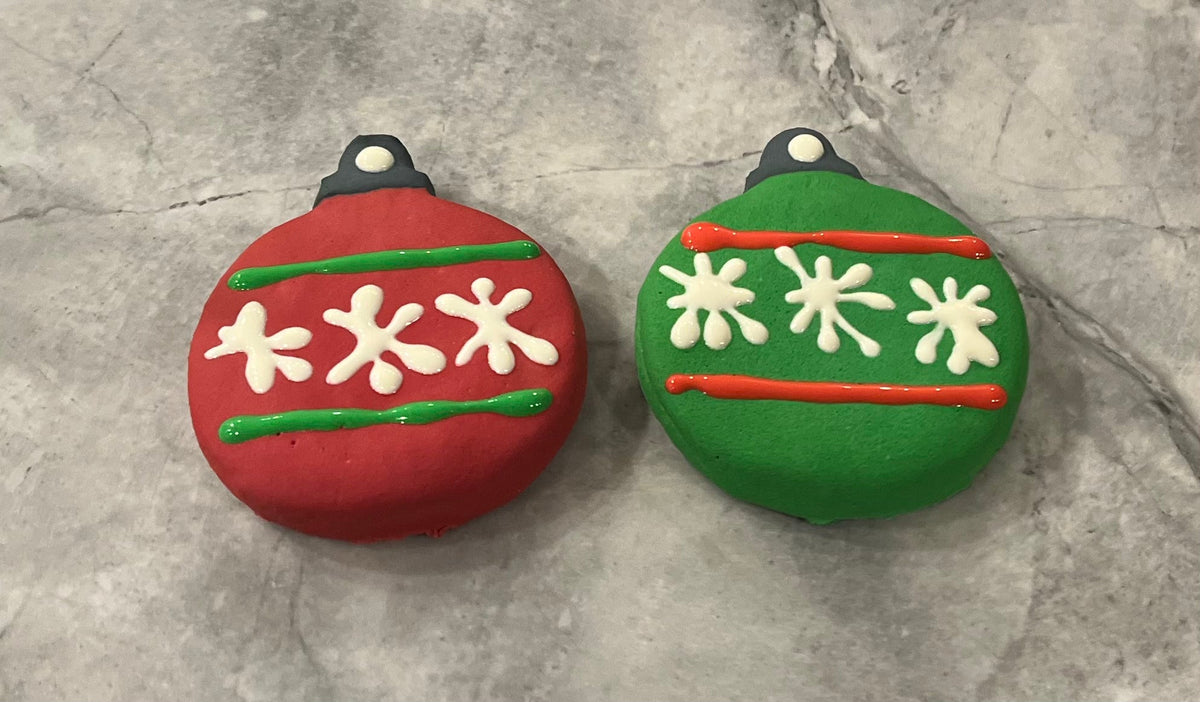 Decorate the tree with these ornaments for your pup! Ingredients: rice flour, oat flour, whey, ground flaxseed, egg whites, baking soda, honey, and yogurt icing. Guaranteed Analysis: Crude protein 9.84%, crude fat 8.53%, crude fiber...