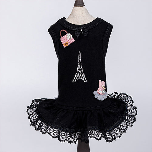 Paris Dog Dress Black offers top-rated by pet lovers. Hello Doggie's, new Paris dress is made from 100 cotton featuring an Eiffel Tower appliqué with a crotchet purse and bunny. Perfect fit for the spring season.