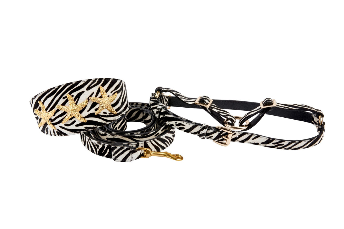 Zebra Print Hair On Hide Italian Leather 3 Wide Collar With Gold Starfish, Leash & Harness Set